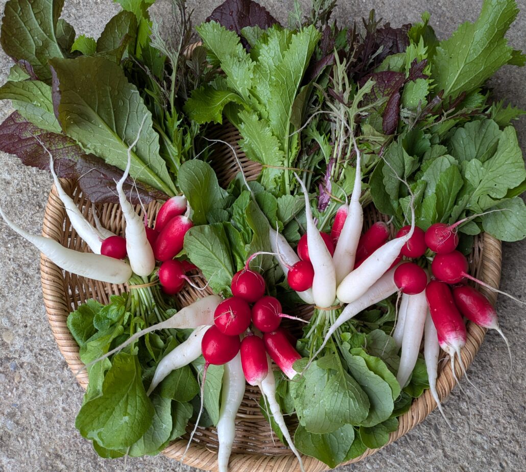 6-8 unterschiedliche Gemüsesorten. Das Angebot reicht von Kohlrabi, Radieschen, Gelberüben über verschiedene Salate bis hin zu Paprika, Tomaten, Gurken und vielem mehr!